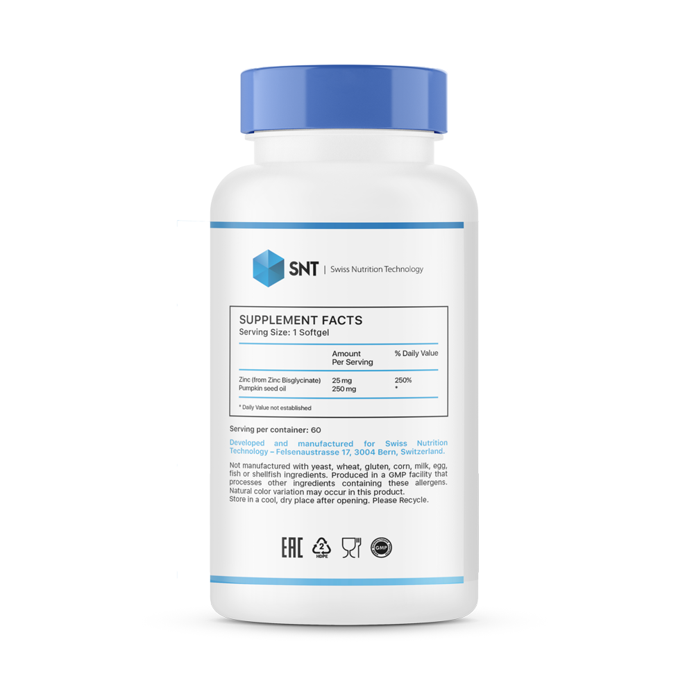 Хелатные формы цинка с наилучшим усвоением. Цинк является иммуномодулятором, тормозя распространение вируса в организме и стимулируя выработку клеток Т-киллеров. Этот минерал участвует в образовании тестостерона и инсулина, необходим для нормализации сахара в крови, влияет на рост волос, состояние ногтей и на секрецию сальных желез, а также укрепляет кости.
