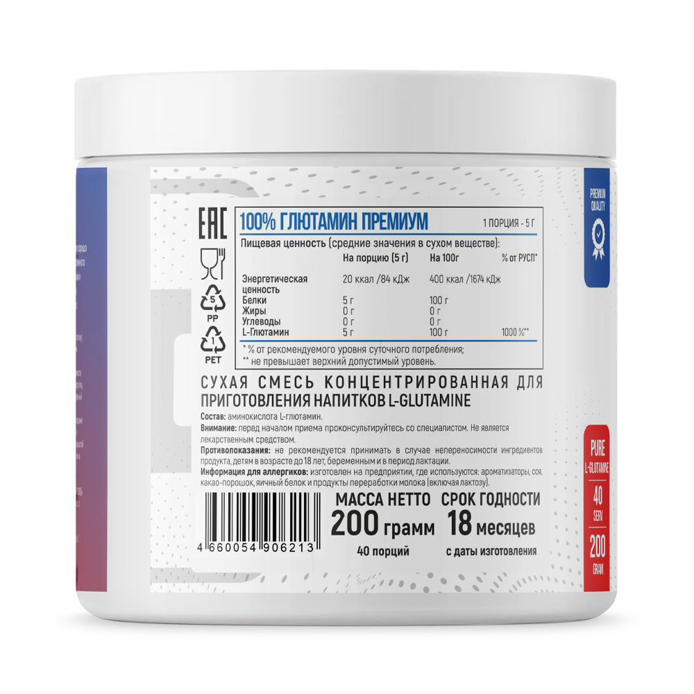 Глютамин Премиум: чистота и максимальное усвоение! L-глютамин одинаково хорошо подходит как новичкам, так и профессионалам. Изготовлен из высококачественного сырья и прошел несколько этапов обработки. Не содержит сахара, красителей и ароматизаторов. Вы получаете исключительно чистый 100%-ный глютамин в биодоступной форме. Благодаря этому он отлично усваивается в желудке и с минимальными потерями попадает в мышцы.